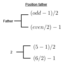Based on the previous equations, it is possible to derive the position of the father node from the position of the current node, taking into account whether the index is even or odd and greater than zero. This restriction is necessary because the root node is located at position zero and, therefore, does not have a parent.